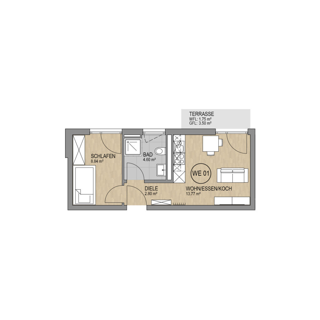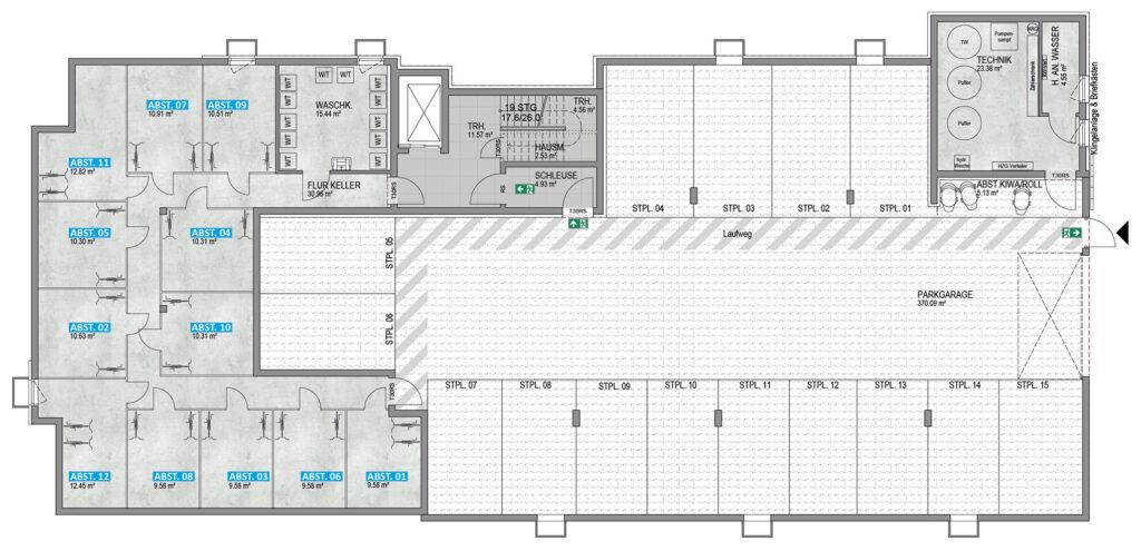 Die Zufahrt der Tiefgarage ist eben an den öffentlichen Raum angebunden und über das Treppenhaus und den Aufzug bequem erreichbar – ein Plus an Komfort, Nachhaltigkeit und Werterhalt für Ihr Eigentum. Alle aktuellen Anforderungen an Belüftung, Brandschutz und Barrierefreiheit werden erfüllt.